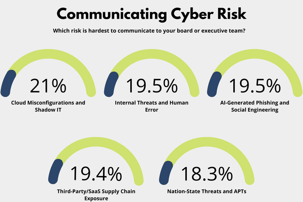 Leading the poll with 21.0%, cloud misconfigurations and shadow IT topped the list as the most challenging risks to communicate to executives.