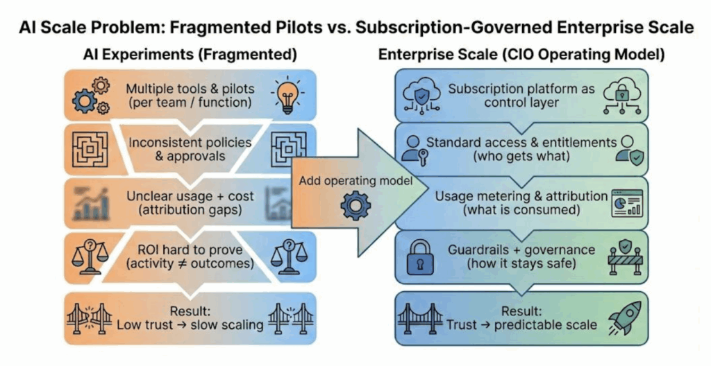 Subscription platforms are becoming a CIO imperative because they provide the missing operating layer, the mechanism that turns AI from experimentation into an enterprise capability that leaders can fund, govern, and expand quarter after quarter.
