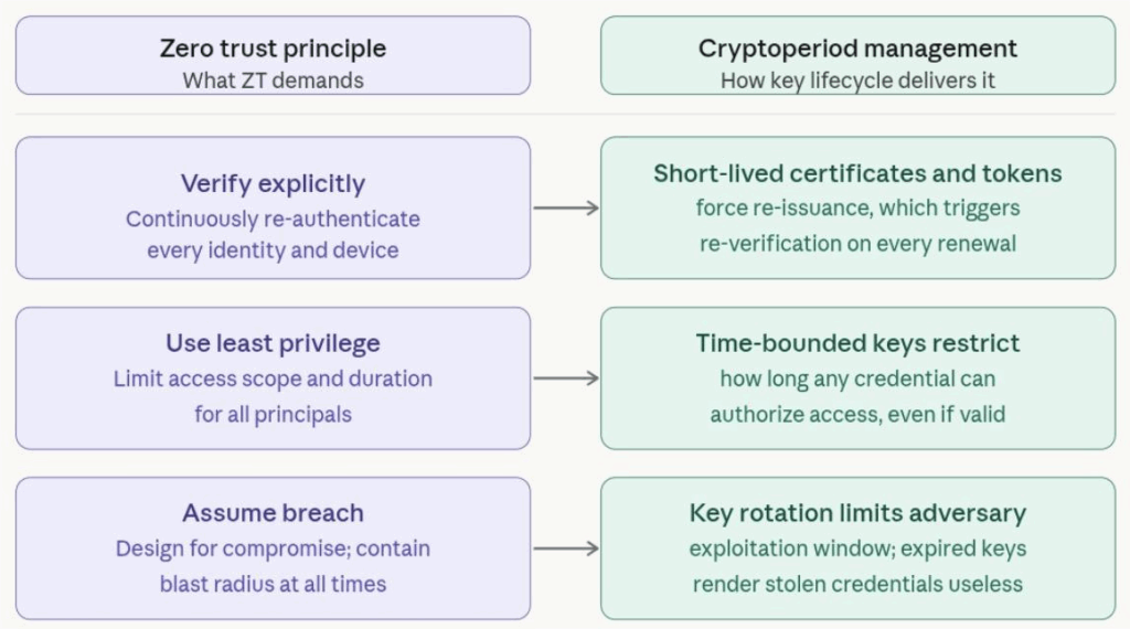 Interestingly, while the military has employed this technique for many decades, cryptoperiod management aligns closely with modern Zero Trust principles, as depicted in the chart below.